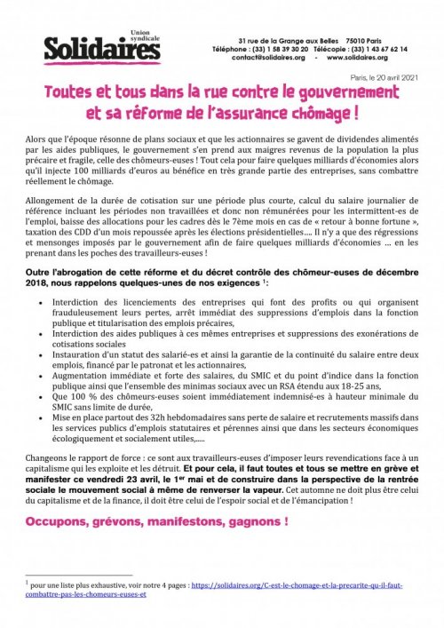 Solidaires national Toutes et tous dans la rue contre le gouvernement et sa réforme de l’assurance chômage ! 20 Avr, 202121 Avr, 2021 Lire la suite