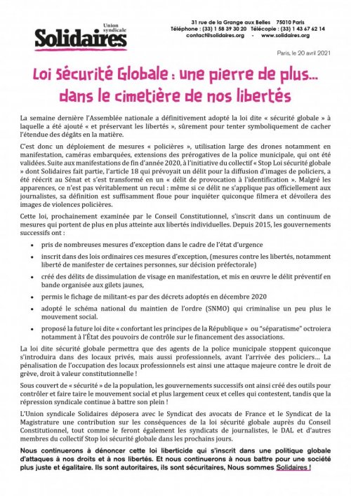 Solidaires national Loi Sécurité Globale : Une pierre de plus… dans le cimetière de nos libertés 20 Avr, 202121 Avr, 2021 Lire la suite Solidaires national Guadeloupe : des jeunes en formation condamné∙es pour désertion 19 Avr, 202121 Avr, 2021 Lire la suite Solidaires national Hong Kong : Exigeons l’arrêt des persécutions contre les combattant.es de la liberté ! 19 Avr, 202121 Avr, 2021 Lire la suite Solidaires national 23 avril : Vendredi de la GROSSE colère 19 Avr, 202121 Avr, 2021 Lire la suite Sud Educ Mobilisations contre la réforme de l’assurance chômage 17 Avr, 202120 Avr, 2021 Lire la suite 23 avrilassurance chômageluttelutte interprofessionnelleprécaritéToulouse Tour des secteurs Contre la répression anti-syndicale : soutien à notre camarade Gwenn ! 17 Avr, 202118 Avr, 2021 Lire la suite Solidaires national Elections dans les très petites entreprises et associations : un fiasco prévisible 16 Avr, 202118 Avr, 2021 Lire la suite Sud Educ 1er mai 2021 : Ensemble pour les droits sociaux et les libertés 16 Avr, 202127 Avr, 2021 Lire la suite Solidaires national RSISL – réunion plénière par visio le samedi 24 avril 2021 à 18h 16 Avr, 202118 Avr, 2021 Lire la suite Solidaires national (SUD Commerces et Services) AMAZON : un an (et deux condamnations) plus tard 16 Avr, 202118 Avr, 2021 Lire la suite 100101102103104 Nos commissions FéminismeLGBTI+ImmigrationInternational Les collectifs amis Étiquettesantifascisme antiracisme assurance chômage cheminots chômage conditions de travail crise sanitaire culture féminisme grève hopital intermittents international lutte lutte interprofessionnelle lycéens manifestation mobilisation précaires précarité rail rassemblement retraites répression salaire sans-papiers santé service public sncf Solidaires solidarité sud education 31 sud rail SUD Santé Sociaux sud éducation syndicat syndicats sécurité sociale Toulouse Université urgence sanitaire urgence sociale violences policières éducation éducation nationale Un seul cookie sera déposé sur ton ordinateur pour faciliter ta navigation. Pas plus ! Accepter Refuser