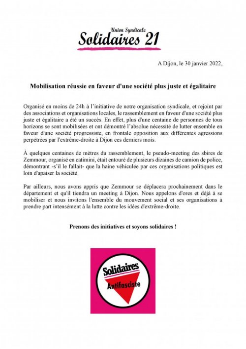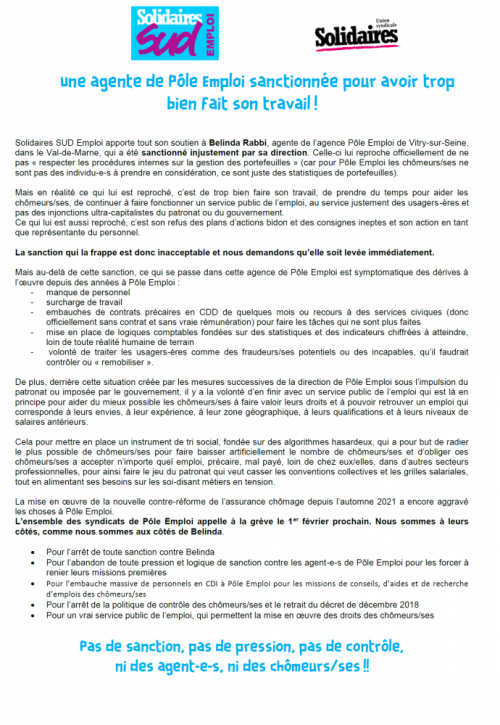 Solidaires national Une agente de Pôle Emploi sanctionnée pour avoir trop bien fait son travail ! 31 Jan, 20223 Fév, 2022 Lire la suite Solidaires national (SUD Santé Sociaux) AFFAIRE ORPEA : Quand l’appât du gain mène au scandale 31 Jan, 20223 Fév, 2022 Lire la suite Solidaires national (Solidaires 21) Mobilisation réussie en faveur d’une société plus juste et égalitaire 31 Jan, 20223 Fév, 2022 Lire la suite Solidaires national Cercle de Solidarité avec les demandeurs d’asile à Montluçon 31 Jan, 20223 Fév, 2022 Lire la suite Solidaires national Prise de parole de Solidaires Allier le 27 janvier à Montluçon 29 Jan, 20223 Fév, 2022 Lire la suite Solidaires national Interview de Murielle Guilbert, co-déléguée générale de Solidaires, au Média le jeudi 27 janvier 28 Jan, 20223 Fév, 2022 Lire la suite Solidaires national EDF au Mexique, ou le cynisme d’un système à son paroxysme 28 Jan, 20223 Fév, 2022 Lire la suite Solidaires national 27 janvier, mobilisation conséquente ! 28 Jan, 20223 Fév, 2022 Lire la suite Tour des secteurs Maitres nageurs sauveteurs – déréglementation de la profession 28 Jan, 20223 Fév, 2022 Lire la suite 4142434445 Nos commissions FéminismeLGBTI+ImmigrationInternational Les collectifs amis Étiquettesantifascisme antiracisme assurance chômage cheminots chômage conditions de travail crise sanitaire culture féminisme grève hopital intermittents international lutte lutte interprofessionnelle lycéens manifestation mobilisation précaires précarité rail rassemblement retraites répression salaire sans-papiers santé service public sncf Solidaires solidarité sud education 31 sud rail SUD Santé Sociaux sud éducation syndicat syndicats sécurité sociale Toulouse Université urgence sanitaire urgence sociale violences policières éducation éducation nationale Un seul cookie sera déposé sur ton ordinateur pour faciliter ta navigation. Pas plus ! Accepter Refuser
