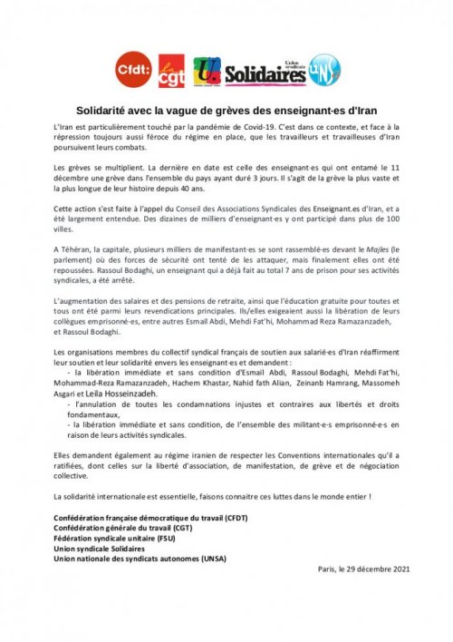 Solidaires national Solidarité avec la vague de grèves des enseignant·es d’Iran 30 Déc, 20216 Jan, 2022 Lire la suite Solidaires national En Pologne, en France et ailleurs, le syndicalisme combat l’extrême droite ! 30 Déc, 20216 Jan, 2022 Lire la suite Solidaires national La petite revue de presse du 29 décembre 2021 29 Déc, 20216 Jan, 2022 Lire la suite Solidaires national SUD Education mobilise pour les enseignants, les élèves et leurs familles 29 Déc, 20216 Jan, 2022 Lire la suite Tour des secteurs Soutien à Sud-Education Ain, attaqué par des fascistes. 28 Déc, 20216 Jan, 2022 Lire la suite Solidaires national A quand les vraies mesures anti-pandémie ? 28 Déc, 20216 Jan, 2022 Lire la suite Tour des secteurs Brochure – « Harcèlement sexuel : agissez pour briser le silence » 27 Déc, 20216 Jan, 2022 Lire la suite Tour des secteurs Qu’est-ce que le syndicat SUD Collectivités Territoriales ? 27 Déc, 20216 Jan, 2022 Lire la suite Tour des secteurs Sections locales SUDCT31 26 Déc, 20216 Jan, 2022 Lire la suite Solidaires national Syndicats et associations de chômeurs appellent les allocataires à témoigner 26 Déc, 20216 Jan, 2022 Lire la suite 5152535455 Nos commissions FéminismeLGBTI+ImmigrationInternational Les collectifs amis Étiquettesantifascisme antiracisme assurance chômage cheminots chômage conditions de travail crise sanitaire culture féminisme grève hopital intermittents international lutte lutte interprofessionnelle lycéens manifestation mobilisation précaires précarité rail rassemblement retraites répression salaire sans-papiers santé service public sncf Solidaires solidarité sud education 31 sud rail SUD Santé Sociaux sud éducation syndicat syndicats sécurité sociale Toulouse Université urgence sanitaire urgence sociale violences policières éducation éducation nationale Un seul cookie sera déposé sur ton ordinateur pour faciliter ta navigation. Pas plus ! Accepter Refuser