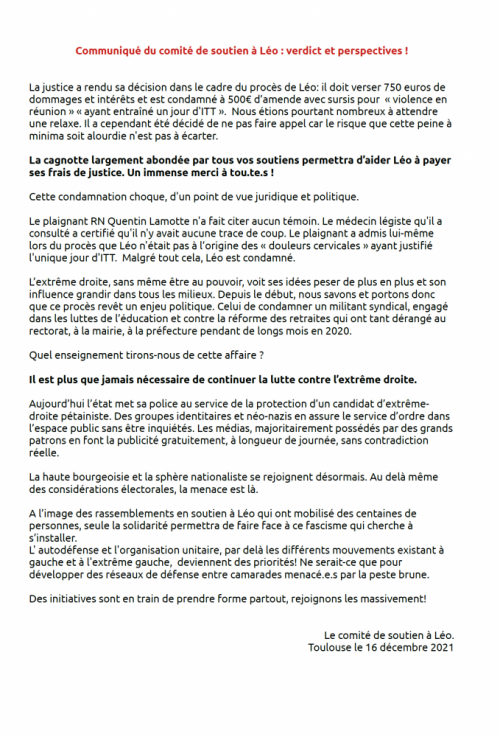 Tour des secteurs Procès de Léo: verdict et perspectives antifascistes.Le communiqué du comité de soutien. 16 Déc, 20216 Jan, 2022 Lire la suite Solidaires national SALAIRES : Toutes les raisons de lutter 16 Déc, 20216 Jan, 2022 Lire la suite Sud Educ Nouvelles du jeudi 16 décembre 16 Déc, 20216 Jan, 2022 Lire la suite 5455565758 Nos commissions FéminismeLGBTI+ImmigrationInternational Les collectifs amis Étiquettesantifascisme antiracisme assurance chômage cheminots chômage conditions de travail crise sanitaire culture féminisme grève hopital intermittents international lutte lutte interprofessionnelle lycéens manifestation mobilisation précaires précarité rail rassemblement retraites répression salaire sans-papiers santé service public sncf Solidaires solidarité sud education 31 sud rail SUD Santé Sociaux sud éducation syndicat syndicats sécurité sociale Toulouse Université urgence sanitaire urgence sociale violences policières éducation éducation nationale Un seul cookie sera déposé sur ton ordinateur pour faciliter ta navigation. Pas plus ! Accepter Refuser