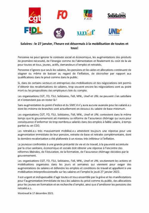 Solidaires national Communiqué du comité de soutien à Léo : verdict et perspectives ! 17 Déc, 20216 Jan, 2022 Lire la suite Solidaires national Salaires : le 27 janvier, l’heure est désormais à la mobilisation de toutes et tous ! 17 Déc, 20216 Jan, 2022 Lire la suite Solidaires national Contrôles, radiations (pôle emploi, caf) : Appel à témoignages et à AG 17 Déc, 20216 Jan, 2022 Lire la suite Tour des secteurs Procès de Léo: verdict et perspectives antifascistes.Le communiqué du comité de soutien. 16 Déc, 20216 Jan, 2022 Lire la suite Solidaires national SALAIRES : Toutes les raisons de lutter 16 Déc, 20216 Jan, 2022 Lire la suite Sud Educ Nouvelles du jeudi 16 décembre 16 Déc, 20216 Jan, 2022 Lire la suite 5455565758 Nos commissions FéminismeLGBTI+ImmigrationInternational Les collectifs amis Étiquettesantifascisme antiracisme assurance chômage cheminots chômage conditions de travail crise sanitaire culture féminisme grève hopital intermittents international lutte lutte interprofessionnelle lycéens manifestation mobilisation précaires précarité rail rassemblement retraites répression salaire sans-papiers santé service public sncf Solidaires solidarité sud education 31 sud rail SUD Santé Sociaux sud éducation syndicat syndicats sécurité sociale Toulouse Université urgence sanitaire urgence sociale violences policières éducation éducation nationale Un seul cookie sera déposé sur ton ordinateur pour faciliter ta navigation. Pas plus ! Accepter Refuser