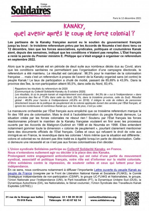 Solidaires national KANAKY, quel avenir après le coup de force colonial ? 12 Déc, 20216 Jan, 2022 Lire la suite Solidaires national En solidarité avec les migrants plusieurs initiatives organisées sur les 3 villes de l’Allier les 18 et 19 décembre 2021 12 Déc, 20216 Jan, 2022 Lire la suite Tour des secteurs Après avoir refusé de recevoir les représentant.e.s des écoles REP+ en grève, le DASEN ment (OKLM) dans la dépêche du midi. 11 Déc, 20216 Jan, 2022 Lire la suite Solidaires national (SUD TAS) Victoire : Le TA de Montreuil annule la sanction de notre collègue AURIANNE 10 Déc, 20216 Jan, 2022 Lire la suite Sud Educ Agir contre le climat de haines et de violences fascistes 10 Déc, 20216 Jan, 2022 Lire la suite Solidaires national Campagne Antiracisme et Solidarité 10 Déc, 20216 Jan, 2022 Lire la suite Sud Educ Collectif des Travailleurs Sans-Papiers de Vitry 10 Déc, 20216 Jan, 2022 Lire la suite Tour des secteurs La lutte dans la REP+ s'(auto) organise. Retour et perspectives de la journée de mobilisation du 6 décembre ! 10 Déc, 20216 Jan, 2022 Lire la suite Solidaires national Absence de mesure générale (gel du point) et inflation = Perte de salaire dans la FP. 10 Déc, 20216 Jan, 2022 Lire la suite 5657585960 Nos commissions FéminismeLGBTI+ImmigrationInternational Les collectifs amis Étiquettesantifascisme antiracisme assurance chômage cheminots chômage conditions de travail crise sanitaire culture féminisme grève hopital intermittents international lutte lutte interprofessionnelle lycéens manifestation mobilisation précaires précarité rail rassemblement retraites répression salaire sans-papiers santé service public sncf Solidaires solidarité sud education 31 sud rail SUD Santé Sociaux sud éducation syndicat syndicats sécurité sociale Toulouse Université urgence sanitaire urgence sociale violences policières éducation éducation nationale Un seul cookie sera déposé sur ton ordinateur pour faciliter ta navigation. Pas plus ! Accepter Refuser