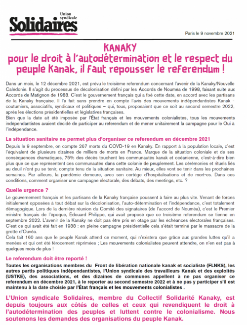Solidaires national KANAKY – Pour le droit à l’autodétermination et le respect du peuple Kanak, il faut repousser le referendum ! 9 Nov, 202113 Nov, 2021 Lire la suite Solidaires national Augmenter les salaires, c’est urgent ! 9 Nov, 202113 Nov, 2021 Lire la suite Solidaires national Les agent-es publics plébiscitent le statut de la fonction publique 9 Nov, 202113 Nov, 2021 Lire la suite Solidaires national Manifestaton nationale des retraité-e-s le 2 décembre à Paris 9 Nov, 202113 Nov, 2021 Lire la suite 6667686970 Nos commissions FéminismeLGBTI+ImmigrationInternational Les collectifs amis Étiquettesantifascisme antiracisme assurance chômage cheminots chômage conditions de travail crise sanitaire culture féminisme grève hopital intermittents international lutte lutte interprofessionnelle lycéens manifestation mobilisation précaires précarité rail rassemblement retraites répression salaire sans-papiers santé service public sncf Solidaires solidarité sud education 31 sud rail SUD Santé Sociaux sud éducation syndicat syndicats sécurité sociale Toulouse Université urgence sanitaire urgence sociale violences policières éducation éducation nationale Un seul cookie sera déposé sur ton ordinateur pour faciliter ta navigation. Pas plus ! Accepter Refuser
