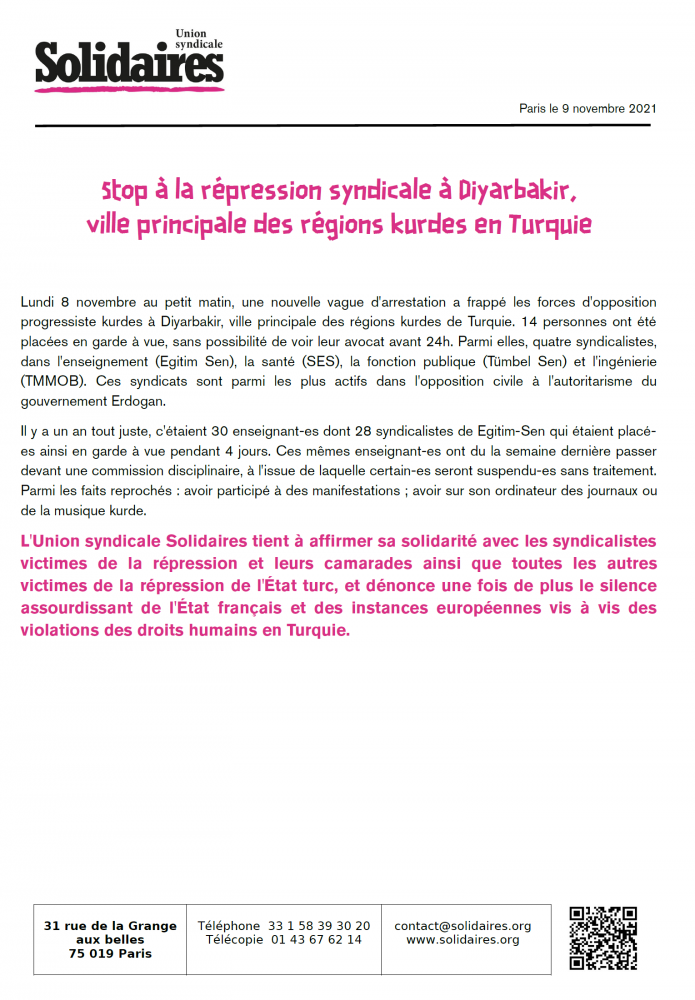 Solidaires national Stop à la répression syndicale à Diyarbakir, ville principale des régions kurdes en Turquie 9 Nov, 202113 Nov, 2021 Lire la suite Solidaires national KANAKY – Pour le droit à l’autodétermination et le respect du peuple Kanak, il faut repousser le referendum ! 9 Nov, 202113 Nov, 2021 Lire la suite Solidaires national Augmenter les salaires, c’est urgent ! 9 Nov, 202113 Nov, 2021 Lire la suite Solidaires national Les agent-es publics plébiscitent le statut de la fonction publique 9 Nov, 202113 Nov, 2021 Lire la suite Solidaires national Manifestaton nationale des retraité-e-s le 2 décembre à Paris 9 Nov, 202113 Nov, 2021 Lire la suite 6667686970 Nos commissions FéminismeLGBTI+ImmigrationInternational Les collectifs amis Étiquettesantifascisme antiracisme assurance chômage cheminots chômage conditions de travail crise sanitaire culture féminisme grève hopital intermittents international lutte lutte interprofessionnelle lycéens manifestation mobilisation précaires précarité rail rassemblement retraites répression salaire sans-papiers santé service public sncf Solidaires solidarité sud education 31 sud rail SUD Santé Sociaux sud éducation syndicat syndicats sécurité sociale Toulouse Université urgence sanitaire urgence sociale violences policières éducation éducation nationale Un seul cookie sera déposé sur ton ordinateur pour faciliter ta navigation. Pas plus ! Accepter Refuser