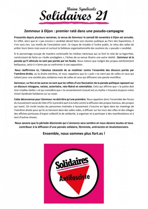 Solidaires national (Solidaires 21) Zemmour à Dijon : premier raté dans une pseudo-campagne 5 Nov, 202113 Nov, 2021 Lire la suite Solidaires national STOP aux violences sexistes et sexuelles ! 4 Nov, 202113 Nov, 2021 Lire la suite Solidaires national Face à la crise climatique, passons à l’action ! 4 Nov, 202113 Nov, 2021 Lire la suite Solidaires national (SUD Santé Sociaux) SEGUR : tous-tes trahi-es, certain-es plus que d’autres ! 3 Nov, 202113 Nov, 2021 Lire la suite Les luttes en coursTour des secteursUrgence Sociale, urgence Sanitaire, urgence climatique Soutien à Léo 2 Nov, 2021 Lire la suite 6768697071 Nos commissions FéminismeLGBTI+ImmigrationInternational Les collectifs amis Étiquettesantifascisme antiracisme assurance chômage cheminots chômage conditions de travail crise sanitaire culture féminisme grève hopital intermittents international lutte lutte interprofessionnelle lycéens manifestation mobilisation précaires précarité rail rassemblement retraites répression salaire sans-papiers santé service public sncf Solidaires solidarité sud education 31 sud rail SUD Santé Sociaux sud éducation syndicat syndicats sécurité sociale Toulouse Université urgence sanitaire urgence sociale violences policières éducation éducation nationale Un seul cookie sera déposé sur ton ordinateur pour faciliter ta navigation. Pas plus ! Accepter Refuser