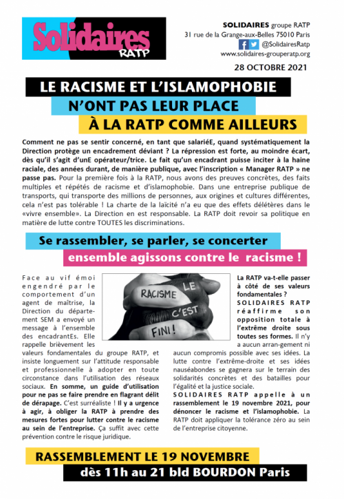 Solidaires national (Solidaires groupe Ratp) Le racisme et l’islamophobie n’ont pas leur place à la Ratp comme ailleurs 29 Oct, 202113 Nov, 2021 Lire la suite Solidaires national (SUD PTT) Libertés syndicales à la poste : une victoire pour notre syndicalisme ! 29 Oct, 202113 Nov, 2021 Lire la suite 6869707172