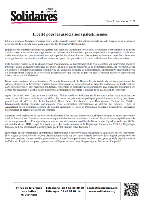 Solidaires national Liberté pour les associations palestiniennes 27 Oct, 202113 Nov, 2021 Lire la suite Solidaires national Employé-es, prenons le pouvoir ! 27 Oct, 202113 Nov, 2021 Lire la suite Solidaires national (Vidéo) L’extrême-droite, ennemie des travailleuses et des travailleurs 26 Oct, 202113 Nov, 2021 Lire la suite 6970717273 Nos commissions FéminismeLGBTI+ImmigrationInternational Les collectifs amis Étiquettesantifascisme antiracisme assurance chômage cheminots chômage conditions de travail crise sanitaire culture féminisme grève hopital intermittents international lutte lutte interprofessionnelle lycéens manifestation mobilisation précaires précarité rail rassemblement retraites répression salaire sans-papiers santé service public sncf Solidaires solidarité sud education 31 sud rail SUD Santé Sociaux sud éducation syndicat syndicats sécurité sociale Toulouse Université urgence sanitaire urgence sociale violences policières éducation éducation nationale Un seul cookie sera déposé sur ton ordinateur pour faciliter ta navigation. Pas plus ! Accepter Refuser