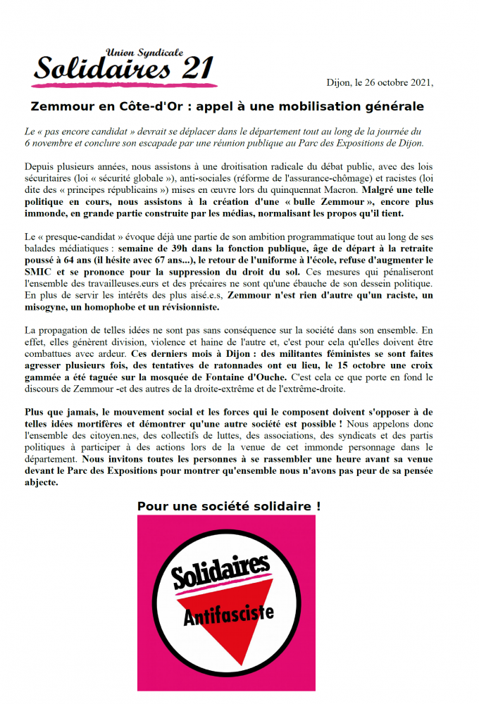 Solidaires national (Solidaires 21) Zemmour en Côte-d’Or le 6 novembre : appel à une mobilisation générale ! 27 Oct, 202113 Nov, 2021 Lire la suite Solidaires national Liberté pour les associations palestiniennes 27 Oct, 202113 Nov, 2021 Lire la suite Solidaires national Employé-es, prenons le pouvoir ! 27 Oct, 202113 Nov, 2021 Lire la suite Solidaires national (Vidéo) L’extrême-droite, ennemie des travailleuses et des travailleurs 26 Oct, 202113 Nov, 2021 Lire la suite 6970717273 Nos commissions FéminismeLGBTI+ImmigrationInternational Les collectifs amis Étiquettesantifascisme antiracisme assurance chômage cheminots chômage conditions de travail crise sanitaire culture féminisme grève hopital intermittents international lutte lutte interprofessionnelle lycéens manifestation mobilisation précaires précarité rail rassemblement retraites répression salaire sans-papiers santé service public sncf Solidaires solidarité sud education 31 sud rail SUD Santé Sociaux sud éducation syndicat syndicats sécurité sociale Toulouse Université urgence sanitaire urgence sociale violences policières éducation éducation nationale Un seul cookie sera déposé sur ton ordinateur pour faciliter ta navigation. Pas plus ! Accepter Refuser