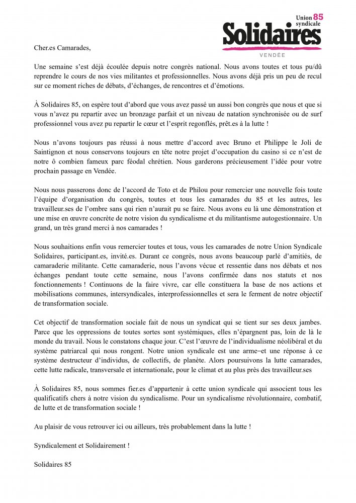 Tour des secteurs Contractuel.le.s dans la Fonction Publique Territoriale 25 Oct, 202113 Nov, 2021 Lire la suite Tour des secteurs Guide du temps de travail dans la Fonction Publique Territoriale 25 Oct, 202113 Nov, 2021 Lire la suite Tour des secteurs Formations 2022 – prochainement en ligne 25 Oct, 202113 Nov, 2021 Lire la suite Solidaires national Pour une bibliothèque accessible à tous 25 Oct, 202113 Nov, 2021 Lire la suite Solidaires national Réforme de l’assurance chômage : la lutte continue ! 22 Oct, 202113 Nov, 2021 Lire la suite Solidaires national Plan santé au travail 2021-2026 L’État se défausse de ses responsabilités d’employeur ! 22 Oct, 202113 Nov, 2021 Lire la suite Sud Educ Nous voulons des hausses de salaires, de pensions, d’allocations et des minimas sociaux pas de ridicules indemnités ! 22 Oct, 202113 Nov, 2021 Lire la suite Solidaires national remerciements post congrès 21 Oct, 202113 Nov, 2021 Lire la suite Sud Educ Les nouvelles du jeudi 21 Octobre 21 Oct, 202113 Nov, 2021 Lire la suite Tour des secteurs Droit de réponse – bilan MIXITÉ SOCIALE (fermeture de collèges de quartier) 21 Oct, 202113 Nov, 2021 Lire la suite 7071727374 Nos commissions FéminismeLGBTI+ImmigrationInternational Les collectifs amis Étiquettesantifascisme antiracisme assurance chômage cheminots chômage conditions de travail crise sanitaire culture féminisme grève hopital intermittents international lutte lutte interprofessionnelle lycéens manifestation mobilisation précaires précarité rail rassemblement retraites répression salaire sans-papiers santé service public sncf Solidaires solidarité sud education 31 sud rail SUD Santé Sociaux sud éducation syndicat syndicats sécurité sociale Toulouse Université urgence sanitaire urgence sociale violences policières éducation éducation nationale Un seul cookie sera déposé sur ton ordinateur pour faciliter ta navigation. Pas plus ! Accepter Refuser