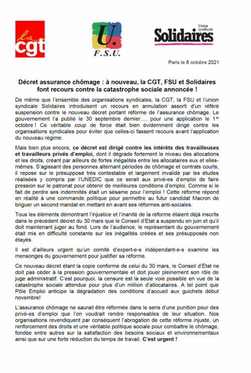 Solidaires national Décret assurance chômage : à nouveau, la CGT, FSU et Solidaires font recours contre la catastrophe sociale annoncée ! 8 Oct, 202114 Oct, 2021 Lire la suite Solidaires nationalTour des secteurs 17 octobre 1961: un massacre colonial d’État – 15, 16, 17 octobre 2021, week-end anticolonial à Toulouse 7 Oct, 202114 Oct, 2021 Lire la suite Solidaires national Arrestation des militants sans-papiers 7 Oct, 202114 Oct, 2021 Lire la suite Sud Educ Nouvelles du jeudi 7 octobre 2021 7 Oct, 20218 Oct, 2021 Lire la suite Solidaires national (Vidéo) Ne reste pas seul.e, syndique-toi à Solidaires ! 7 Oct, 202114 Oct, 2021 Lire la suite Tour des secteurs Régularisation pour les jeunes étranger·e·s en formation – Pétition unitaire 7 Oct, 202114 Oct, 2021 Lire la suite Solidaires national Les JT Décalés du 8ème congrès de Solidaires 7 Oct, 202114 Oct, 2021 Lire la suite Solidaires national Grignon, pognon, béton… 7 Oct, 20218 Oct, 2021 Lire la suite 7475767778 Nos commissions FéminismeLGBTI+ImmigrationInternational Les collectifs amis Étiquettesantifascisme antiracisme assurance chômage cheminots chômage conditions de travail crise sanitaire culture féminisme grève hopital intermittents international lutte lutte interprofessionnelle lycéens manifestation mobilisation précaires précarité rail rassemblement retraites répression salaire sans-papiers santé service public sncf Solidaires solidarité sud education 31 sud rail SUD Santé Sociaux sud éducation syndicat syndicats sécurité sociale Toulouse Université urgence sanitaire urgence sociale violences policières éducation éducation nationale Un seul cookie sera déposé sur ton ordinateur pour faciliter ta navigation. Pas plus ! Accepter Refuser