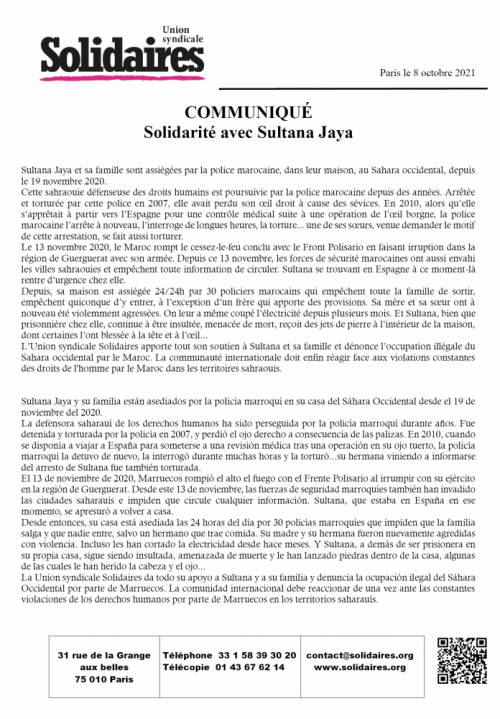 Solidaires national Solidarité avec Sultana Jaya 8 Oct, 202114 Oct, 2021 Lire la suite Solidaires national (Solidaires Météo) Météo-Infos de septembre 2021 8 Oct, 202114 Oct, 2021 Lire la suite Solidaires national Décret assurance chômage : à nouveau, la CGT, FSU et Solidaires font recours contre la catastrophe sociale annoncée ! 8 Oct, 202114 Oct, 2021 Lire la suite Solidaires nationalTour des secteurs 17 octobre 1961: un massacre colonial d’État – 15, 16, 17 octobre 2021, week-end anticolonial à Toulouse 7 Oct, 202114 Oct, 2021 Lire la suite Solidaires national Arrestation des militants sans-papiers 7 Oct, 202114 Oct, 2021 Lire la suite Sud Educ Nouvelles du jeudi 7 octobre 2021 7 Oct, 20218 Oct, 2021 Lire la suite Solidaires national (Vidéo) Ne reste pas seul.e, syndique-toi à Solidaires ! 7 Oct, 202114 Oct, 2021 Lire la suite Tour des secteurs Régularisation pour les jeunes étranger·e·s en formation – Pétition unitaire 7 Oct, 202114 Oct, 2021 Lire la suite Solidaires national Les JT Décalés du 8ème congrès de Solidaires 7 Oct, 202114 Oct, 2021 Lire la suite Solidaires national Grignon, pognon, béton… 7 Oct, 20218 Oct, 2021 Lire la suite 7475767778 Nos commissions FéminismeLGBTI+ImmigrationInternational Les collectifs amis Étiquettesantifascisme antiracisme assurance chômage cheminots chômage conditions de travail crise sanitaire culture féminisme grève hopital intermittents international lutte lutte interprofessionnelle lycéens manifestation mobilisation précaires précarité rail rassemblement retraites répression salaire sans-papiers santé service public sncf Solidaires solidarité sud education 31 sud rail SUD Santé Sociaux sud éducation syndicat syndicats sécurité sociale Toulouse Université urgence sanitaire urgence sociale violences policières éducation éducation nationale Un seul cookie sera déposé sur ton ordinateur pour faciliter ta navigation. Pas plus ! Accepter Refuser