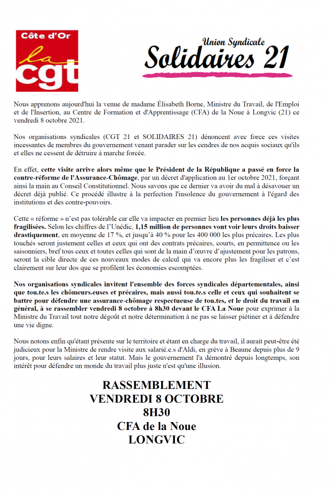 Solidaires national Contre la réforme de l’assurance chômage, rassemblement avec la CGT le 8 octobre à 9 h à Longvic à l’occasion d’une visite d’E. Borne 6 Oct, 20218 Oct, 2021 Lire la suite Solidaires national Pétition pour la libération des enfants palestiniens 5 Oct, 20218 Oct, 2021 Lire la suite Solidaires national Appel au mois international d’actions pour exiger la libération de Georges Abdallah ! 5 Oct, 20218 Oct, 2021 Lire la suite Solidaires national Les motions d’actualités du 8e congrès de l’Union syndicale Solidaires (septembre 2021) 4 Oct, 20218 Oct, 2021 Lire la suite Sud Educ Solidaires accompagne le voyage pour la Vie et dénonce la répression contre les communautés zapatistes, au Chiapas(Mexique) 4 Oct, 20218 Oct, 2021 Lire la suite Solidaires national Réforme assurance chômage : Macron passe en force ! 4 Oct, 20218 Oct, 2021 Lire la suite Solidaires national Cerises la coopérative n°29, octobre 2021 4 Oct, 20218 Oct, 2021 Lire la suite Tour des secteurs Permanences Sud CT à Saint-Gaudens 4 Oct, 202113 Nov, 2021 Lire la suite Sud Educ Soutien à la mobilisation sociale au Brésil 4 Oct, 20218 Oct, 2021 Lire la suite 7576777879 Nos commissions FéminismeLGBTI+ImmigrationInternational Les collectifs amis Étiquettesantifascisme antiracisme assurance chômage cheminots chômage conditions de travail crise sanitaire culture féminisme grève hopital intermittents international lutte lutte interprofessionnelle lycéens manifestation mobilisation précaires précarité rail rassemblement retraites répression salaire sans-papiers santé service public sncf Solidaires solidarité sud education 31 sud rail SUD Santé Sociaux sud éducation syndicat syndicats sécurité sociale Toulouse Université urgence sanitaire urgence sociale violences policières éducation éducation nationale Un seul cookie sera déposé sur ton ordinateur pour faciliter ta navigation. Pas plus ! Accepter Refuser