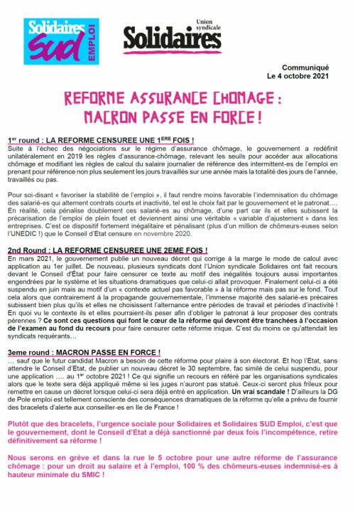 Solidaires national Réforme assurance chômage : Macron passe en force ! 4 Oct, 20218 Oct, 2021 Lire la suite Solidaires national Cerises la coopérative n°29, octobre 2021 4 Oct, 20218 Oct, 2021 Lire la suite Tour des secteurs Permanences Sud CT à Saint-Gaudens 4 Oct, 202113 Nov, 2021 Lire la suite Sud Educ Soutien à la mobilisation sociale au Brésil 4 Oct, 20218 Oct, 2021 Lire la suite 7576777879 Nos commissions FéminismeLGBTI+ImmigrationInternational Les collectifs amis Étiquettesantifascisme antiracisme assurance chômage cheminots chômage conditions de travail crise sanitaire culture féminisme grève hopital intermittents international lutte lutte interprofessionnelle lycéens manifestation mobilisation précaires précarité rail rassemblement retraites répression salaire sans-papiers santé service public sncf Solidaires solidarité sud education 31 sud rail SUD Santé Sociaux sud éducation syndicat syndicats sécurité sociale Toulouse Université urgence sanitaire urgence sociale violences policières éducation éducation nationale Un seul cookie sera déposé sur ton ordinateur pour faciliter ta navigation. Pas plus ! Accepter Refuser