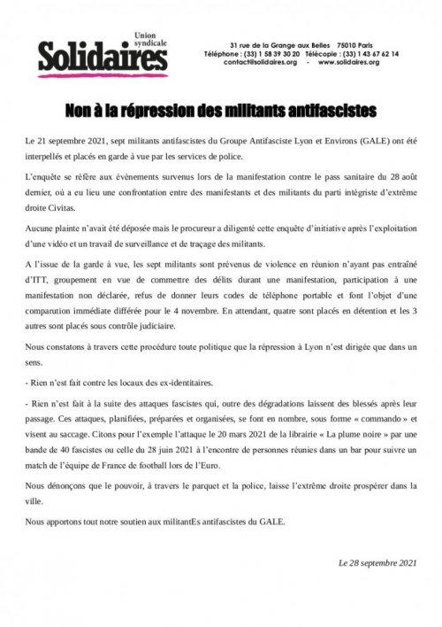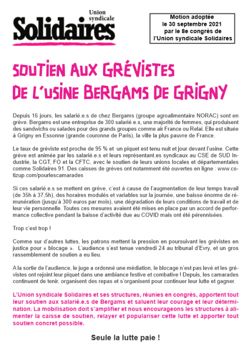 Solidaires national Soutien aux grèvistes de l’usine Bergams à Grigny ! 3 Oct, 20218 Oct, 2021 Lire la suite Solidaires national Face à l’inflation, obtenons l’augmentation des rémunérations ! 3 Oct, 20218 Oct, 2021 Lire la suite Solidaires national Contribution de SUD Industrie 1 Oct, 20218 Oct, 2021 Lire la suite Sud Educ Déclaration du 8e congrès de l’Union syndicale Solidaires 1 Oct, 20218 Oct, 2021 Lire la suite Solidaires national Pour la relance du logement social et le droit au logement pour tout.e.s ! 30 Sep, 20218 Oct, 2021 Lire la suite Sud Educ Nouvelles du jeudi 30 Septembre 30 Sep, 20218 Oct, 2021 Lire la suite Solidaires national Non à la répression des militants antifascistes 29 Sep, 202130 Sep, 2021 Lire la suite Tour des secteurs Rassemblement contre la loi Rilhac.Mercredi 29 septembre 14h00 28 Sep, 202130 Sep, 2021 Lire la suite Solidaires national Soutien aux grévistes de Transdev 28 Sep, 202130 Sep, 2021 Lire la suite Solidaires national Retraité·es : dans la rue le 1er octobre 28 Sep, 202130 Sep, 2021 Lire la suite 7778798081 Nos commissions FéminismeLGBTI+ImmigrationInternational Les collectifs amis Étiquettesantifascisme antiracisme assurance chômage cheminots chômage conditions de travail crise sanitaire culture féminisme grève hopital intermittents international lutte lutte interprofessionnelle lycéens manifestation mobilisation précaires précarité rail rassemblement retraites répression salaire sans-papiers santé service public sncf Solidaires solidarité sud education 31 sud rail SUD Santé Sociaux sud éducation syndicat syndicats sécurité sociale Toulouse Université urgence sanitaire urgence sociale violences policières éducation éducation nationale Un seul cookie sera déposé sur ton ordinateur pour faciliter ta navigation. Pas plus ! Accepter Refuser