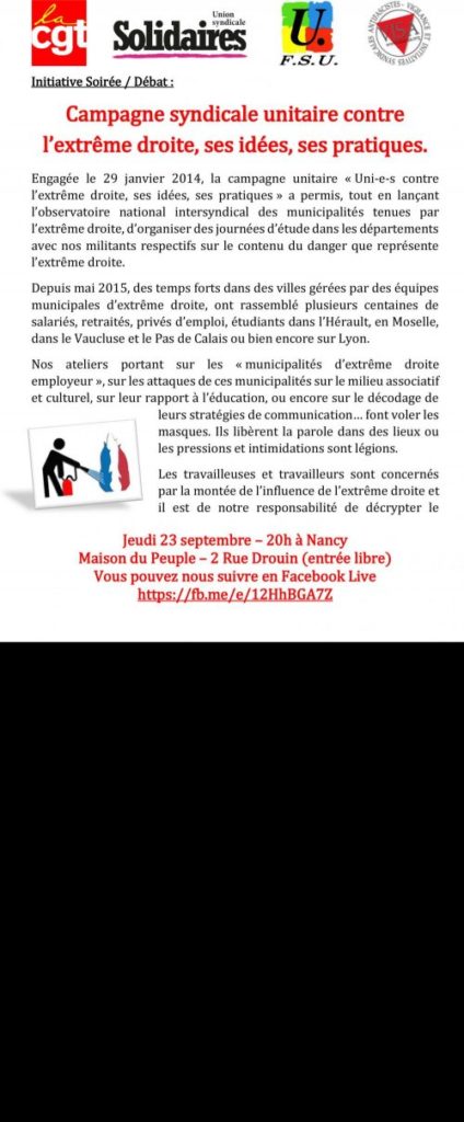 Solidaires national Soirée / débat contre l’extrême droite, ses idées, ses pratiques. 18 Sep, 202130 Sep, 2021 Lire la suite Solidaires national 5 octobre 2021 : Grève et mobilisation pour gagner ! 17 Sep, 202130 Sep, 2021 Lire la suite Solidaires national ABROGATION DU PASSE SANITAIRE 17 Sep, 202130 Sep, 2021 Lire la suite Tour des secteurs Préavis de grève contre le contrôle de la vaccination des élèves 16 Sep, 202130 Sep, 2021 Lire la suite 8081828384 Nos commissions FéminismeLGBTI+ImmigrationInternational Les collectifs amis Étiquettesantifascisme antiracisme assurance chômage cheminots chômage conditions de travail crise sanitaire culture féminisme grève hopital intermittents international lutte lutte interprofessionnelle lycéens manifestation mobilisation précaires précarité rail rassemblement retraites répression salaire sans-papiers santé service public sncf Solidaires solidarité sud education 31 sud rail SUD Santé Sociaux sud éducation syndicat syndicats sécurité sociale Toulouse Université urgence sanitaire urgence sociale violences policières éducation éducation nationale Un seul cookie sera déposé sur ton ordinateur pour faciliter ta navigation. Pas plus ! Accepter Refuser
