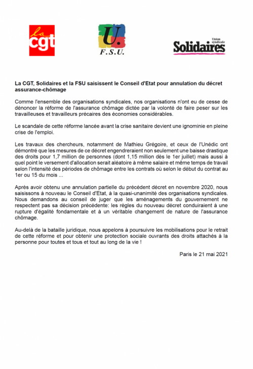 Solidaires national La CGT, Solidaires et la FSU saisissent le Conseil d’Etat pour annulation du décret assurance-chômage 21 Mai, 20214 Juin, 2021 Lire la suite Solidaires national Manifestation pour exiger la régularisation des travailleurs « sans papiers » qui continuent à être exploités par centaines dans les filiales du Groupe La Poste 21 Mai, 20214 Juin, 2021 Lire la suite Solidaires national Nous soutenons le peuple palestinien 21 Mai, 20214 Juin, 2021 Lire la suite Solidaires national COMMUNIQUÉ DU COLLECTIF LCED(63) DU 19 MAI 2021 : VIOLENCES D’EXTRÊME DROITE : UN VENT MAUVAIS SUR CLERMONT 21 Mai, 20214 Juin, 2021 Lire la suite Solidaires national Audrey, assistante sociale assassinée dans l’exercice de ses fonctions 20 Mai, 20214 Juin, 2021 Lire la suite Tour des secteurs Réforme de l’assurance chômage: l’éducation nationale ne sera pas épargnée. Rassemblement samedi 22-Square Charles de Gaulle 14h00 20 Mai, 20214 Juin, 2021 Lire la suite Sud Educ Les nouvelles du jeudi 20 Mai 20 Mai, 20214 Juin, 2021 Lire la suite Solidaires national Appel à manifestation contre le racisme et les idées d’extrême droite le 12 juin 20 Mai, 20214 Juin, 2021 Lire la suite Solidaires national Samedi 22 mai : Solidarité avec le peuple palestinien 20 Mai, 20214 Juin, 2021 Lire la suite Solidaires national Assassinat d’Audrey assistante sociale territoriale 19 Mai, 20214 Juin, 2021 Lire la suite 9192939495 Nos commissions FéminismeLGBTI+ImmigrationInternational Les collectifs amis Étiquettesantifascisme antiracisme assurance chômage cheminots chômage conditions de travail crise sanitaire culture féminisme grève hopital intermittents international lutte lutte interprofessionnelle lycéens manifestation mobilisation précaires précarité rail rassemblement retraites répression salaire sans-papiers santé service public sncf Solidaires solidarité sud education 31 sud rail SUD Santé Sociaux sud éducation syndicat syndicats sécurité sociale Toulouse Université urgence sanitaire urgence sociale violences policières éducation éducation nationale Un seul cookie sera déposé sur ton ordinateur pour faciliter ta navigation. Pas plus ! Accepter Refuser