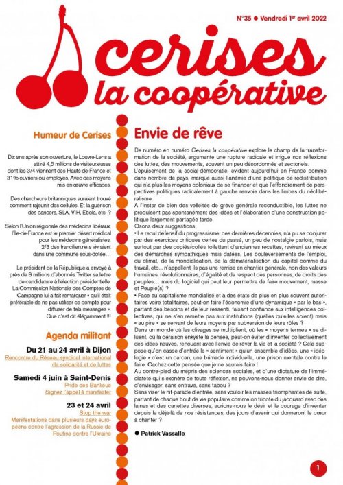Solidaires national Cerises la coopérative n° 35 – 1er avril 2022 4 Avr, 20228 Mai, 2022 Lire la suite Solidaires national Appel de féministes russes à manifester contre la guerre le 2 avril 1 Avr, 20228 Mai, 2022 Lire la suite 123