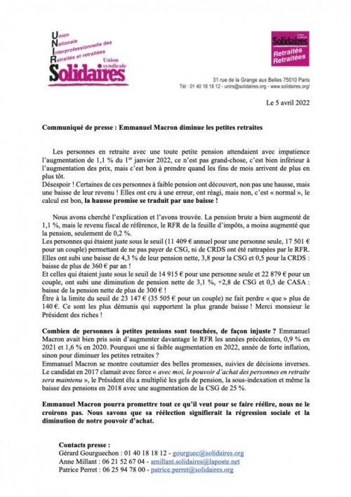 Solidaires national La hausse des pensions diminue la pension nette des plus demunis 6 Avr, 20228 Mai, 2022 Lire la suite Solidaires national (Solidaires SUD Emploi) Lettre aux candidat-es à l’élection présidentielle 4 Avr, 20228 Mai, 2022 Lire la suite Solidaires national Cerises la coopérative n° 35 – 1er avril 2022 4 Avr, 20228 Mai, 2022 Lire la suite Solidaires national Appel de féministes russes à manifester contre la guerre le 2 avril 1 Avr, 20228 Mai, 2022 Lire la suite 123 Nos commissions FéminismeLGBTI+ImmigrationInternational Les collectifs amis Étiquettesantifascisme antiracisme assurance chômage cheminots chômage conditions de travail crise sanitaire culture féminisme grève hopital intermittents international lutte lutte interprofessionnelle lycéens manifestation mobilisation précaires précarité rail rassemblement retraites répression salaire sans-papiers santé service public sncf Solidaires solidarité sud education 31 sud rail SUD Santé Sociaux sud éducation syndicat syndicats sécurité sociale Toulouse Université urgence sanitaire urgence sociale violences policières éducation éducation nationale Un seul cookie sera déposé sur ton ordinateur pour faciliter ta navigation. Pas plus ! Accepter Refuser