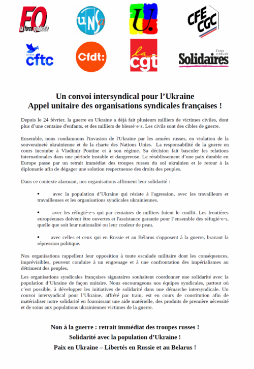 ExpressionsSolidaires national 1er mai 2022 – Plus que jamais mobilisé-es pour nos revendications 30 Avr, 202230 Avr, 2022 Lire la suite Solidaires national Un convoi intersyndical pour l’Ukraine : Appel unitaire des organisations syndicales françaises ! 7 Avr, 202230 Avr, 2022 Lire la suite Solidaires national « Le maintien en détention des prisonniers basques et le mépris de leur état de santé sont ressentis comme des signes d’une logique de vengeance » 7 Avr, 20228 Mai, 2022 Lire la suite Solidaires national 7 AVRIL PERSONNEL DU SECTEUR SOCIAL et MEDICO-SOCIAL FONCTION PUBLIQUE HOSPITALIERE, PRIVE NON LUCRATIF MOBILISES 7 Avr, 20228 Mai, 2022 Lire la suite Solidaires national La hausse des pensions diminue la pension nette des plus demunis 6 Avr, 20228 Mai, 2022 Lire la suite Solidaires national (Solidaires SUD Emploi) Lettre aux candidat-es à l’élection présidentielle 4 Avr, 20228 Mai, 2022 Lire la suite Solidaires national Cerises la coopérative n° 35 – 1er avril 2022 4 Avr, 20228 Mai, 2022 Lire la suite Solidaires national Appel de féministes russes à manifester contre la guerre le 2 avril 1 Avr, 20228 Mai, 2022 Lire la suite 123 Nos commissions FéminismeLGBTI+ImmigrationInternational Les collectifs amis Étiquettesantifascisme antiracisme assurance chômage cheminots chômage conditions de travail crise sanitaire culture féminisme grève hopital intermittents international lutte lutte interprofessionnelle lycéens manifestation mobilisation précaires précarité rail rassemblement retraites répression salaire sans-papiers santé service public sncf Solidaires solidarité sud education 31 sud rail SUD Santé Sociaux sud éducation syndicat syndicats sécurité sociale Toulouse Université urgence sanitaire urgence sociale violences policières éducation éducation nationale Un seul cookie sera déposé sur ton ordinateur pour faciliter ta navigation. Pas plus ! Accepter Refuser