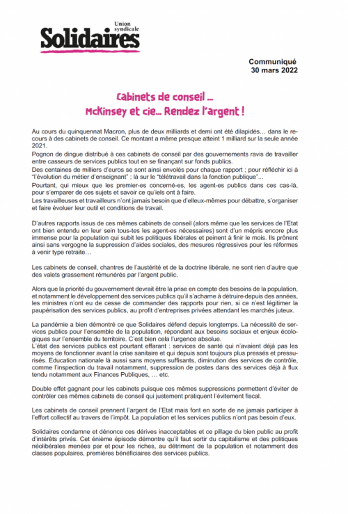 Solidaires national Cabinets de conseil : McKinsey et cie… rendez l’argent 30 Mar, 20228 Mai, 2022 Lire la suite Solidaires national Note n°2 : Guerre en Ukraine Réflexions et propositions d’actions syndicales internationalistes (25 mars 2022). 28 Mar, 20228 Mai, 2022 Lire la suite 1234