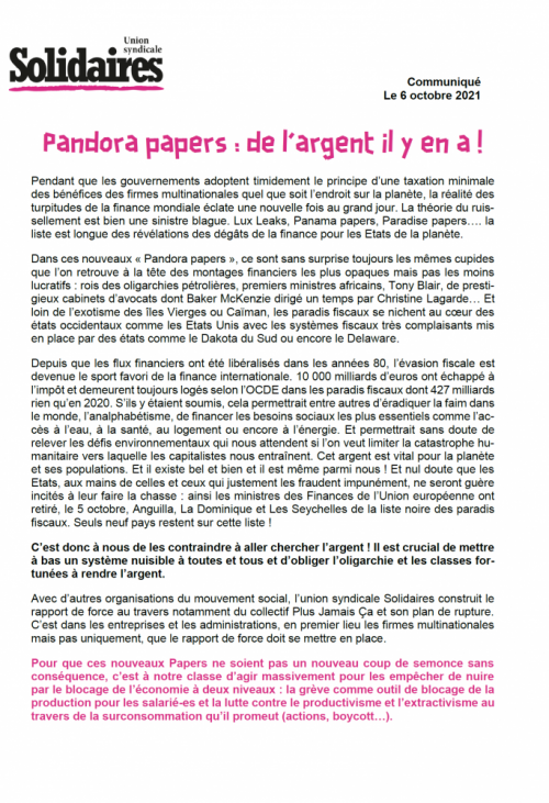 Solidaires national Pandora papers : de l’argent il y en a ! 6 Oct, 20218 Oct, 2021 Lire la suite Solidaires national (SUD CT) Harcèlement, ni au boulot, ni ailleurs ! 6 Oct, 20218 Oct, 2021 Lire la suite 2627282930