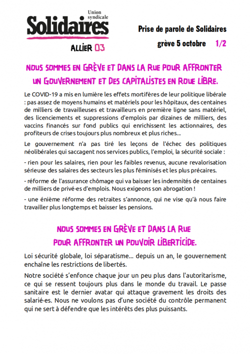 Solidaires national Les JT Décalés du 8ème congrès de Solidaires 7 Oct, 202114 Oct, 2021 Lire la suite Solidaires national Grignon, pognon, béton… 7 Oct, 20218 Oct, 2021 Lire la suite Solidaires national Prise de parole de Solidaires Allier – grève du 5 octobre 7 Oct, 20218 Oct, 2021 Lire la suite Solidaires national Pandora papers : de l’argent il y en a ! 6 Oct, 20218 Oct, 2021 Lire la suite Solidaires national (SUD CT) Harcèlement, ni au boulot, ni ailleurs ! 6 Oct, 20218 Oct, 2021 Lire la suite 2627282930 Nos commissions FéminismeLGBTI+ImmigrationInternational Les collectifs amis Étiquettesantifascisme antiracisme assurance chômage cheminots chômage conditions de travail crise sanitaire culture féminisme grève hopital intermittents international lutte lutte interprofessionnelle lycéens manifestation mobilisation précaires précarité rail rassemblement retraites répression salaire sans-papiers santé service public sncf Solidaires solidarité sud education 31 sud rail SUD Santé Sociaux sud éducation syndicat syndicats sécurité sociale Toulouse Université urgence sanitaire urgence sociale violences policières éducation éducation nationale Un seul cookie sera déposé sur ton ordinateur pour faciliter ta navigation. Pas plus ! Accepter Refuser