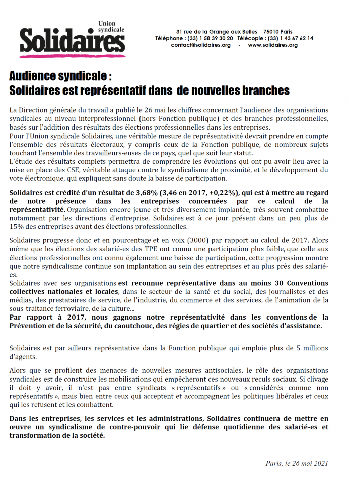 Sud Educ Audience syndicale : Solidaires est représentatif dans de nouvelles branches 26 Mai, 20214 Juin, 2021 Lire la suite