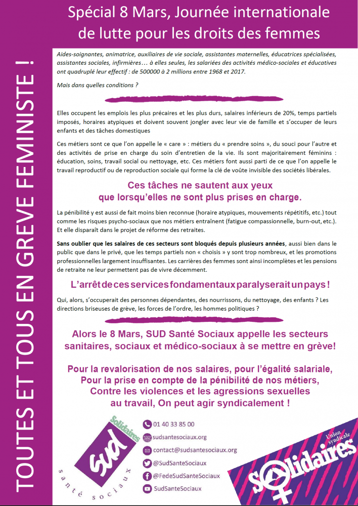 Solidaires nationalTour des secteurs Préavis de grève de la fédération SUD Santé Sociaux pour le 8 mars + 4 pages spécifique à cette journée 21 Fév, 20202 Mar, 2020 Lire la suite ExpressionsTour des secteurs Halte à la répression ! Ne touchez pas à nos élèves ! 15 Fév, 202016 Fév, 2020 Lire la suite éducationéducation nationalelycéensmobilisationrépression ExpressionsLes luttes en coursTour des secteurs Le 14 février 2020 mobilisons nous ensemble pour l’hôpital public ! 9 Fév, 2020 Lire la suite hopitalluttemobilisationsantéservice publicsolidarité 6768697071 Nos commissions FéminismeLGBTI+ImmigrationInternational Les collectifs amis Étiquettesantifascisme antiracisme assurance chômage cheminots chômage conditions de travail crise sanitaire culture féminisme grève hopital intermittents international lutte lutte interprofessionnelle lycéens manifestation mobilisation précaires précarité rail rassemblement retraites répression salaire sans-papiers santé service public sncf Solidaires solidarité sud education 31 sud rail SUD Santé Sociaux sud éducation syndicat syndicats sécurité sociale Toulouse Université urgence sanitaire urgence sociale violences policières éducation éducation nationale Un seul cookie sera déposé sur ton ordinateur pour faciliter ta navigation. Pas plus ! Accepter Refuser