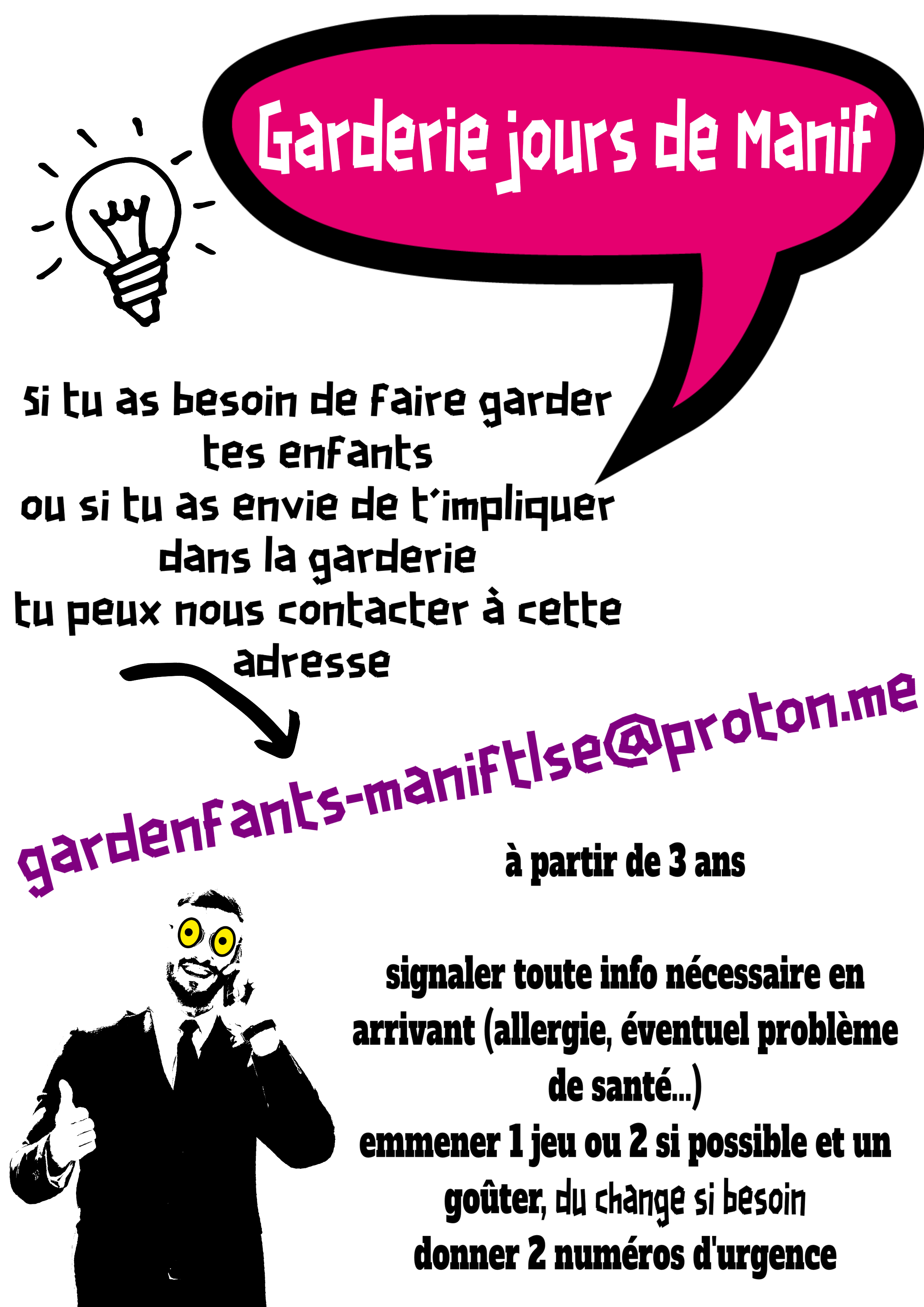 Si tu as besoin de faire garder tes gamin·es, tu peux nous contacter par mail à l’adresse gardenfants-maniftlse@proton.me, nous te répondrons le plus rapidement possible en te donnant le lieu et le contact d’un·e baby-sitter.