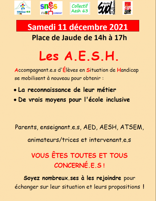 Dans la continuité des mobilisations des AESH, notamment la journée du 19 octobre dernier, pour réclamer un vrai statut, un vrai salaire, la fin des PIAL, un nouveau rendez-vous est donné ce samedi 11 décembre place de Jaude de 14h à 17h par le collectif AESH 63, et les syndicats SUD éducation, CGT éduc’action, FSU.