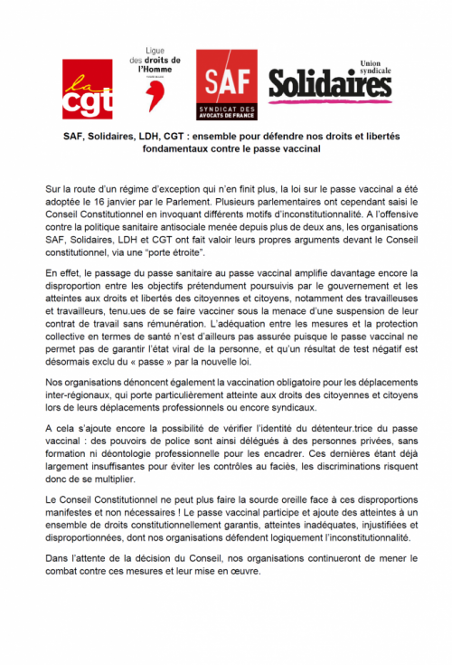 Nos organisations dénoncent également la vaccination obligatoire pour les déplacements inter-régionaux, qui porte particulièrement atteinte aux droits des citoyennes et citoyens lors de leurs déplacements professionnels ou encore syndicaux.