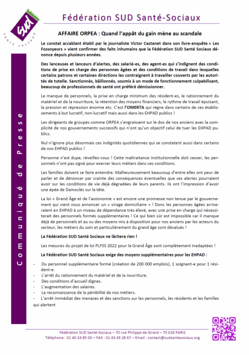 Le constat accablant établi par le journaliste Victor Castanet dans son livre-enquête « Les Fossoyeurs » vient confirmer des faits inhumains que la Fédération SUD Santé Sociaux dé-nonce depuis plusieurs années. Des lanceuses et lanceurs d’alertes, des salarié-es, des agent-es qui s’indignent des conditions de prise en charge des personnes âgées et des conditions de travail dans lesquelles certains patrons et certaines directions les contraignent à travailler couverts par les autorités de tutelle. Sanctionnés, bâillonnés, soumis à un mode de fonctionnement culpabilisant, beaucoup de professionnels de santé ont préféré démissionner.