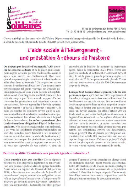 UNIRS Loiret – L’aide sociale à l’hébergement : une prestation à rebours de l’histoire
